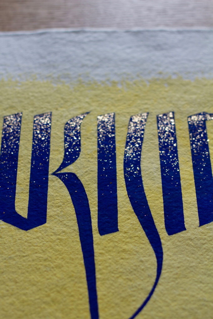 To illustrate this, the top portion of the letters in deep azurite blue are highlighted with sparkling gold flakes. Composed on a background wash of saffron, which has antiseptic qualities of purification and therefore symbolic of cleanliness.